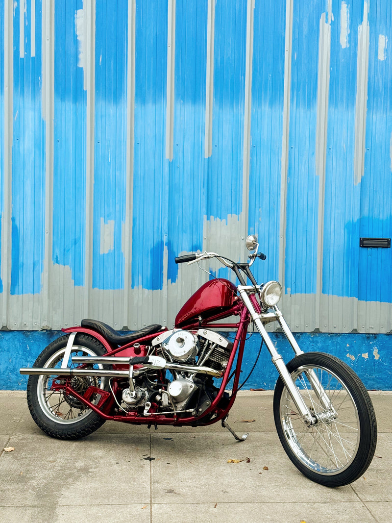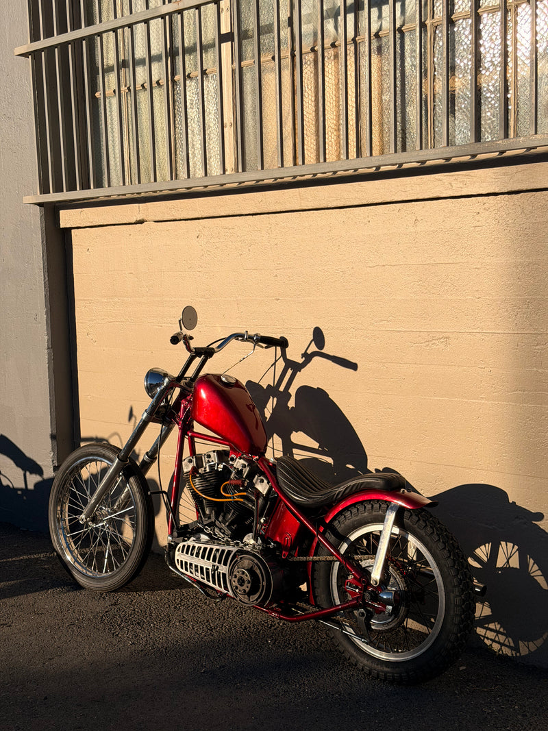 BIKE 2: 1980 Harley Davidson 80” Shovelhead chopper. This is a fresh build, vtwin Hardtail, narrow 41mm front end on Pangea speed triple tree, 21” spool front wheel, 18” high shoulder star hub rear wheel with an original Mechanical brake, foot clutch, hand shift, healthy engine and ratchet top transmission. River seat, bates headlight and a freshly powder coated frame. Comes with Clean California Title!